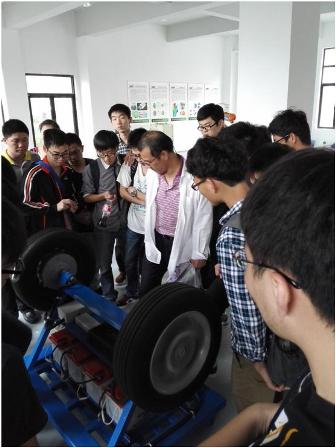 (圖為兆豐機(jī)電研究院院長(zhǎng)雷博士為同學(xué)們介紹電控輪轂單元)